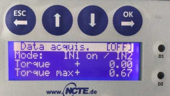 在產(chǎn)品進入測試之前,給IN1一個高電平3~24Vdc 的ON 信號觸發(fā)測試開始;進入扭矩測試,這里完成測試之后儀表會顯示一個峰值,顯示時間為Trigger period設(shè)置的時間;