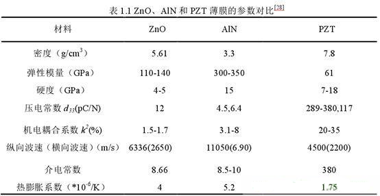 目前應(yīng)用較為廣泛的壓電薄膜材料主要有氮化鋁AlN)、氧化鋅(ZnO)和 PZT系列的壓電薄膜材料。性能比較如下表所示: