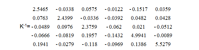 With this inverse matrix the loads that produced any set of simultaneous data from the sensor can be calculated.    We start with the inverse matrix, K-1, and the equation: